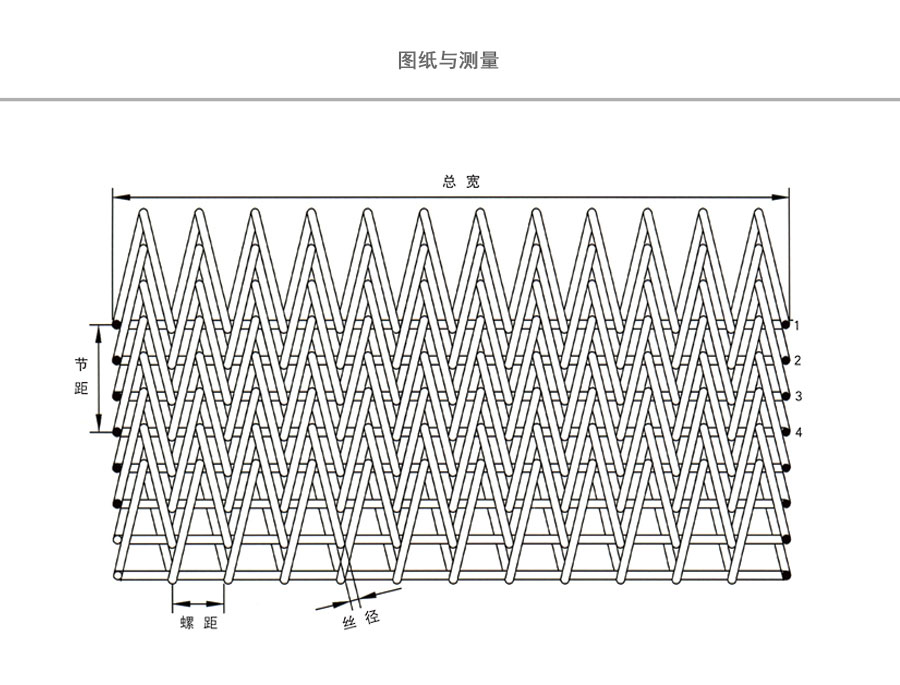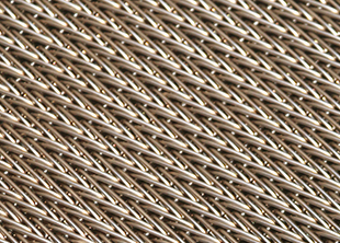 人字形網(wǎng)帶是雙旋網(wǎng)帶的一種變體,依此由左旋和右旋網(wǎng)條形成非常緊密和平整的網(wǎng)面。通常使用直軸。網(wǎng)帶的緊密性使這種網(wǎng)帶很適合輸送小件產(chǎn)品,例如堅(jiān)果、螺栓、螺釘、釘子、小甜餅化式顆粒等。