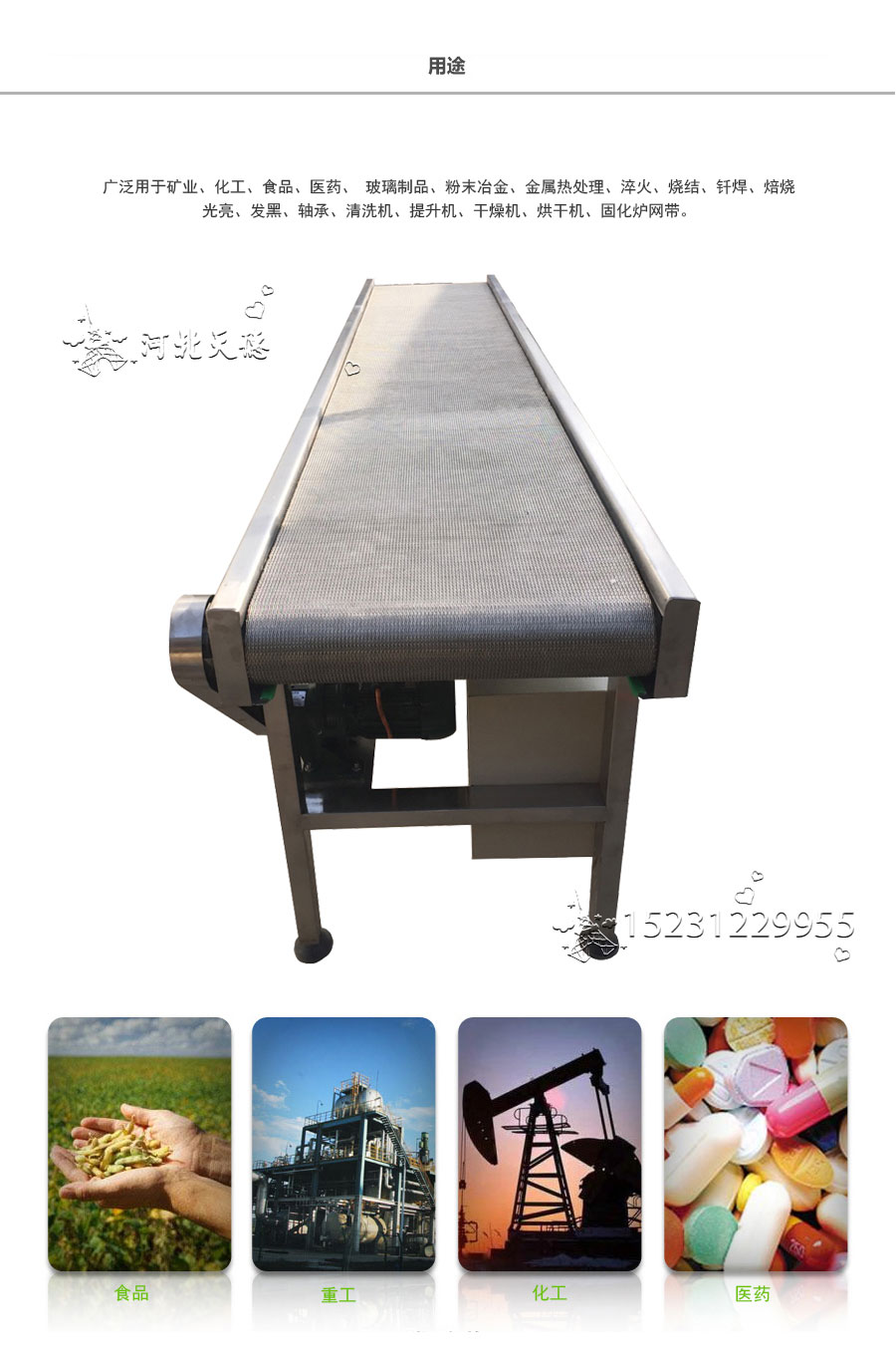 人字形網(wǎng)帶應(yīng)用:主要應(yīng)用于食品烘干機(jī)、蔬菜、海產(chǎn)品清洗機(jī),巴氏機(jī),方便面米粉蒸煮、熱收縮膜包裝機(jī)。玻璃瓶罐、食品、燈炮、金屬、器皿、化纖、印染、醫(yī)藥、電子、粉末冶金、熱處理、木材、物流輸送等各行業(yè)自動(dòng)裝置和自動(dòng)流水線的使用;焦?fàn)t煤氣及電子紅外線等各種窯爐系統(tǒng)的傳動(dòng)使用等食品機(jī)械,玻璃機(jī)械,輸送機(jī)械。
